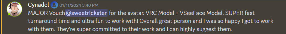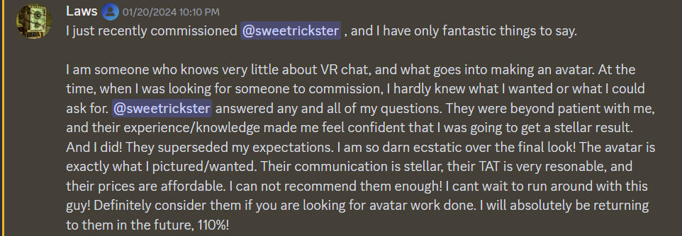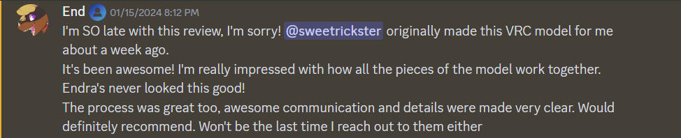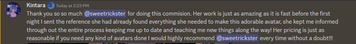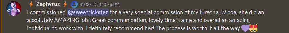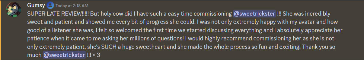 While waiting in the queue, you won’t receive any updates on your place in line. However, you can always check my Trello, linked here, to look at my progress on avatars I’m working on before yours. Once I start in on your commission, you’ll receive updates at each stage of work so you can approve it and I can move on to the next stage. These updates shouldn’t be more than 24 hours apart. If more than 24 hours passes without an update, feel free to reach out and I’ll let you know where I’m at.