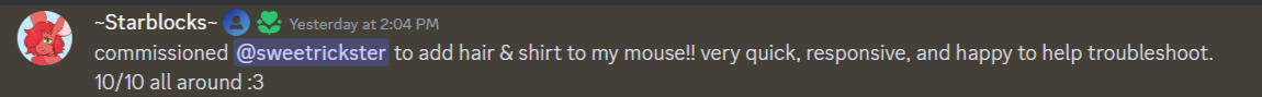 Rush Orders: Vary, anywhere from 10% to 50% upcharge depending on desired deadline, and my current queue.Anything not listed here: Just ask! I’m happy to give quotes on just about any project.