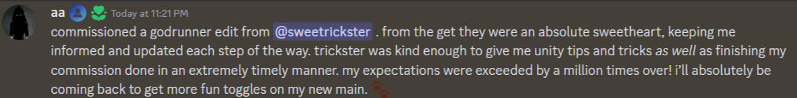 You must own the base avatar that I am retexturing, and possibly some of the assets too. I will inform you about this, and about what final pricing will look like in a quote.I am open to working with sensitive topics, feel free to shoot me a DM and ask about your project.This list is subject to change! If anything else comes up, it will be added to this list and any current clients affected by the change will be notified.